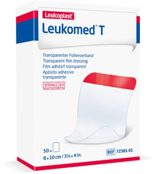 A Leukomed® T egy puha, steril védelmet nyújtó átlátszó filmkötszer. Fedőkötést nem igénylő, jól gyógyuló, de védendő műtéti hegek, bőrfelületek súrlódástól való megóvására. Csökkenti a tenziós (nyomás hatására kialakuló) hólyagoknak előfordulási esélyét. Alkalmas elsődleges sebfedők, katéterek, eszközök rögzítésére. Megbízhatóan tapad, légáter