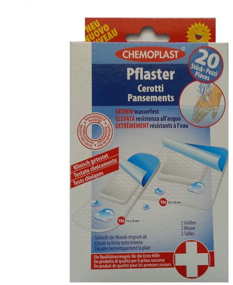 Fürdéshez, zuhanyozáshoz, mosogatáshoz ajánlott. Klinikailag tesztelt, körülzárja a sebet, jól tapad. 20 db-os sebtapasz; Chemoplast termék sebellátáshoz.