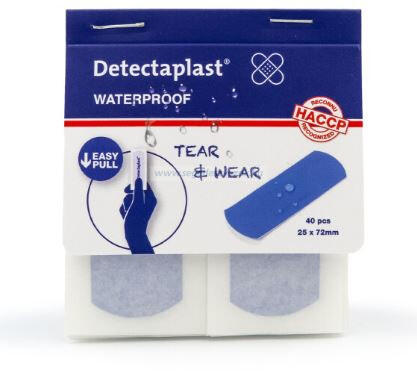 Megfelel a HACCP, IFS és BRC előírásoknak. Öt praktikus Easy-Pull csomagot tartalmazó doboz, amely egyenként 40 univerzális vízálló , kék érzékelős tapaszt tartalmaz. Tapasz mérete: 25 x 72mm A Detectaplast Universal tapaszok vízlepergetőek és szennyeződésállóak, erős PE (polietilén) anyagból készülnek. Univerzális modell - különböző típusú fali adagolókba illes