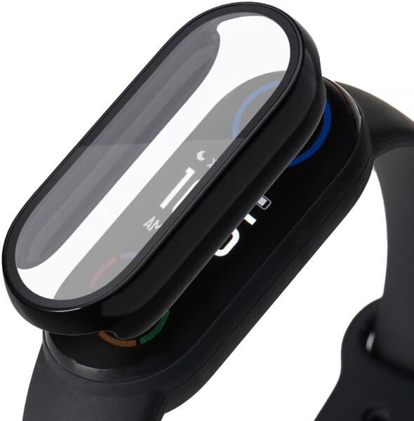 Fekete 360 fokos védőtok Xiaomi Mi Band 3 / 4 / 5 / 6 okoskarkötőhöz. A tok egyidejűleg védi az okoskarkötő oldalát és kijelzőjét is. Az erős fekete keret szorosan illeszkedik a karkötő köré, míg a kijelzőt egy beépített üvegfólia védi.