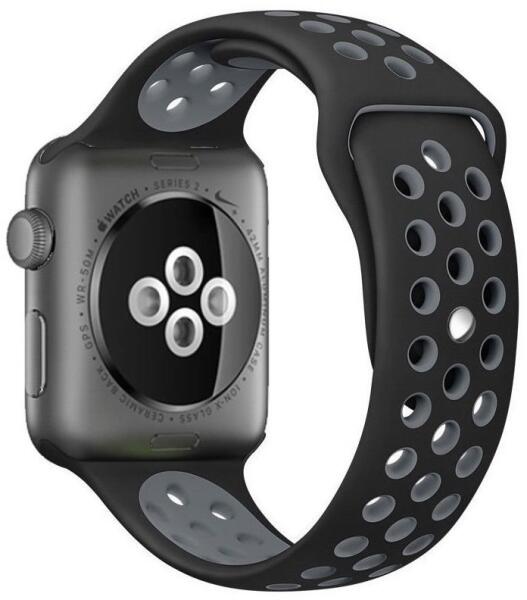 iKi Apple Watch 46mm / 45mm / 44mm / Ultra 49mm lélegző Sport szilikon szíj - fekete/szürke Watch 42mm lélegző Sport szíj sportoláshoz. A szíjon kialakított lyukak csökkentik a súlyát, és javítja a csuklód szellőzését. Dobd fel meglévő Apple Watch készüléked egy sportos és strapabíró kiegészítővel. Anyaga: szilikon, fém csattal Bármilyen 45/44/42mm-es Apple Watch k