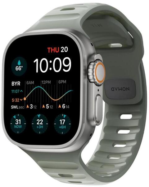 Nomad Sport Band for Apple Watch Úgy tervezték, hogy modern és elegáns sportos megjelenést kölcsönözzön az Apple Watch-nak az intenzív edzésekhez és a mindennapi viselethez. A Sport Band könnyű és lélegző kialakítású, amely puha, rugalmas FKM gumiból készült az egész napos kényelem érdekében. Az alacsony profilú pin-and-tuck mechanizmus biztosítja a biztonságos zárá