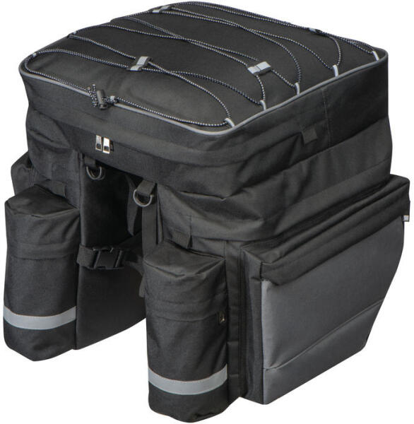 Kiváló minőségű, nagyméretű, csomagtartóra rögzíthető kerékpáros nyeregtáska, számos funkcióval és rekesszel.