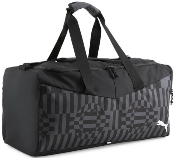 Puma individualRISE közepes sporttáska. Kétirányú cipzárral nyitható tágas fő rekesz. Belseje egyterű. Egyik oldalán cipzáras zseb. Tetején két fix kézbefogó fogantyú, tépőzáras markolat. Hosszú vállpántja állítható kb. 60-120 cm. Kézben és vállon kényelmesen hordható. Külső méretek (Szélesség x Magasság x Mélység) 55 cm x 26 cm x 25 cm.