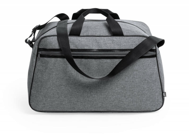 RPET sporttáska 2 cipzáras zsebbel, állítható vállpánttal PVC béléssel. Megkülönböztető RPET jelöléssel. Anyaga: 600D poliészter.