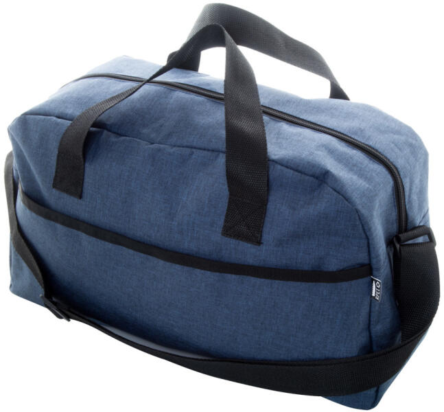 RPET sporttáska elülső zsebbel, cipzáras fő rekesszel és állítható vállpánttal. 600D RPET poliészter, megkülönböztető RPET címkével.