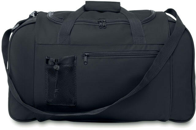 600D poliészter sporttáska 600D poliészter sport- vagy utazótáska. Elülső zsebbel. Állítható és levehető vállpánttal.