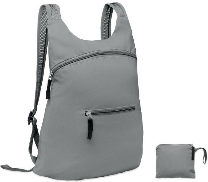 Összehajtható fényv. hátizsák Összehajtható sport hátizsák magas fényvisszaverő képességű 190T poliészterből, cipzáras elülső zsebbel, állítható vállpántokkal.