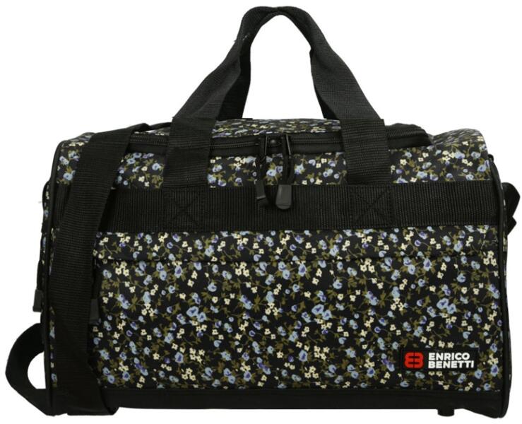 Enrico Benetti márkájú, kisebb méretű női sporttáska, utazótáska, melybe szabadidős tevékenységek kisebb mennyiségű holmija hordható. Klasszikus megjelenésű fekvő elrendezésű , fekete alapon ...