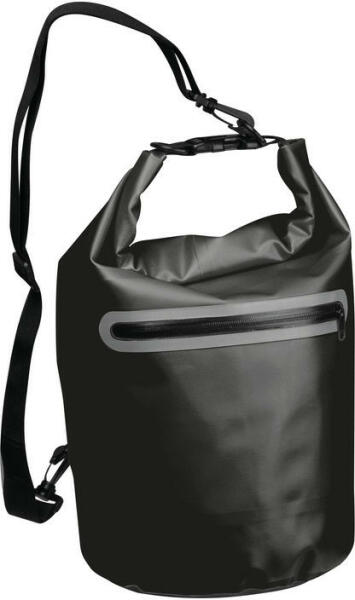 Vízálló, zárható táska, váll- és derékpánttal, elülső fényvisszaverő csíkokkal.