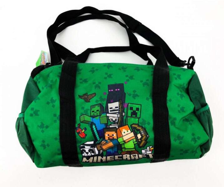 Minecraft zöld sporttáska. Cipzáras 1 nagy méretű reksze jól pakolható, anyaga erős, jól szellőző gyöngy vászon. A táskának kézi fogolya és állíthat vállpántja van. Kényelmes viselet. Egy nagy rekesz ideális szendvicsdoboz, ruházat, pénztárca zsebkendő tárolására. Mindkét oldalán italtartó rekesz vanMérete : 38x24x15 cm