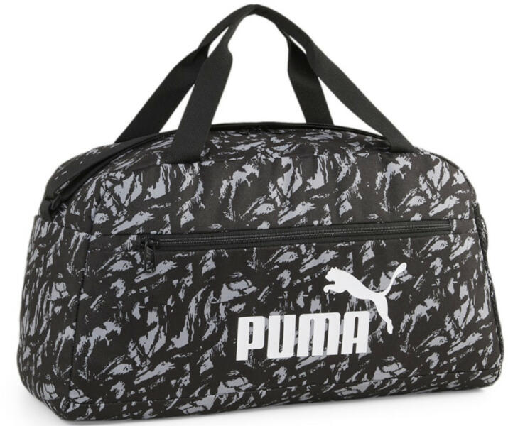 Puma Phase AOP sporttáska. Kétirányú cipzárral nyitható tágas fő rekesz. Belseje egyterű. Elején cipzáras zseb. Egyik oldalán hálós zseb. Tetején két fix kézbefogó fogantyú, kb. 70 cm. Hosszú vállpántja állítható kb. 60-120 cm. Kézben és vállon kényelmesen hordható. Külső méretek (Szélesség x Magasság x Mélység) 50 cm x 25 cm x 23 cm.