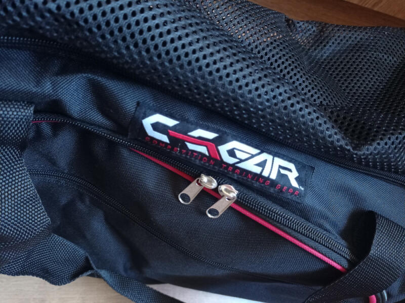 Közepes méretű hálós edzőtáska sok cipzáras zsebbel és rekesszel. Kézben és félvállon hordható.