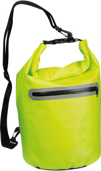 Vízálló, zárható táska, váll- és derékpánttal, elülső fényvisszaverő csíkokkal.