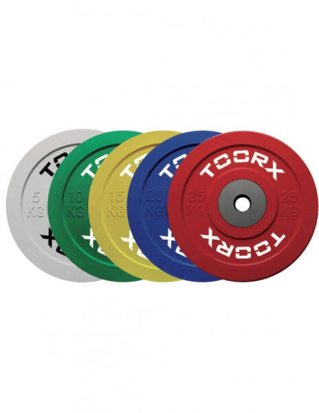 Toorx 50 mm gumírozott tárcsa 5 kg Bumper Plate Crossfit, súlyemelő gyakorlatokhoz Átmérője: 45 cm Színe: Fekete, fehér felirattal