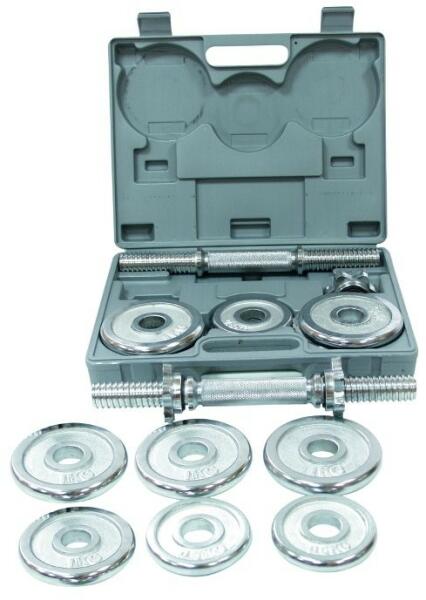 Egykezes súlyzók készlet egy táskában. A tok 2 egykezes tengelyt, egy króm korong készletet tartalmaz. 4 db anya. A műanyag zárható tokban lévő csomagolásnak köszönhetően a súlyzók könnyen hordozhatók és tárolhatók. Műszaki leírás: 2 x tengely 2,5 kg, átmérő: 30 mm, hossz: 35 cm 8 x króm tárcsa 1kg 4 x króm tárcsa 0,5 kg