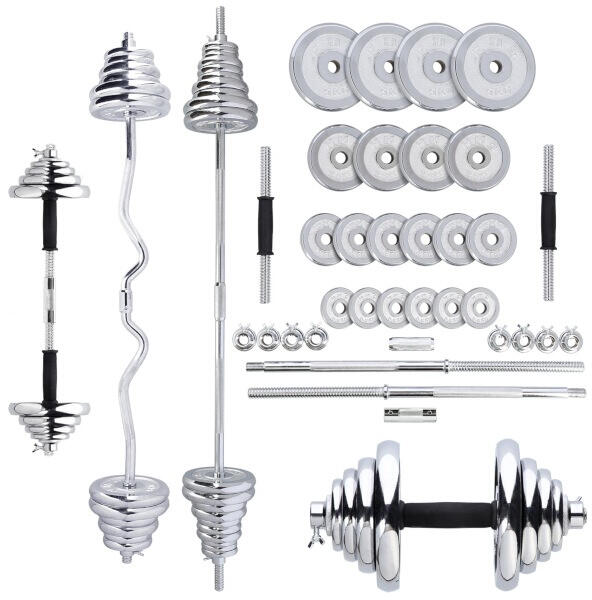 Ez a modell két egykezes súlyzót, egy kihúzható kétkezes súlyzórudat és egy kihúzható tört súlyzórudat tartalmaz. A súlyzók kiváló minőségű krómozott acélból készültek, ami biztosítja a hosszú élettartamukat. A tárcsákat csavaros zárak rögzítik biztonságosan, amelyeket ráadásul szárnyas anyacsavarok rögzítenek. A kétkezes súlyzórúd három részből áll