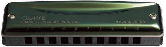 SUZUKI OLIVE HS C20 Bb Szájharmonika Bb Dúr A legújabb fejlesztésű és kétségtelenül az eddig legszebb egysoros, 10 hanglyukú, diatonikus szájharmonika. Gyönyörű, speciálisan kezelt, oliva zöld színű fedőlemezekkel, egyedi kompozit testtel, valamint kiváló minőségű foszfor bronz lamellákkal szerelt prémium kategóriájú szájharmonika. Diatonikus szájharmonikák - A szá