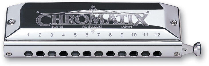 SUZUKI CHROMATIX HS SCX56 C Kromatikus Szájharmonika 56 C Dúr Abszolút Professzionális, 3 és fél oktávos, 14 hanglyukú, 56 hangú kromatikus (váltós) szájharmonika. Kiváló minőségű, krómozott réz fedőlemezek, foszfor bronz lamellák, fekete színű ABS test, kimagaslóan jó légtartás, bársonyos hangtónus jellemzi. Rendelhető hangnem: C A képen a 12 hanglyukú változat l