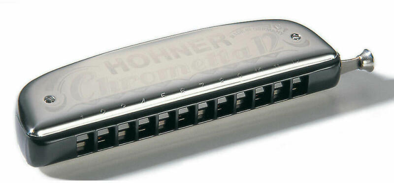 szájharmonika: Chrometta kromatikus szájharmonika, rozsdamentes acél fedőlemez, műanyag test (fésű), 48 darab 1.05 mm réz lamella, 12 hanglyuk, 16.5 cm hosszúság, hangnem: C, robusztus felépítés, kezdőknek is megfelelő