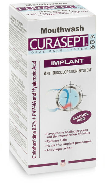 A Curasept ADS Implant szájöblögető egy hatékony plakkcsökkentő készítmény, melynek alapja a 0,2% klórhexidin, szabadalmaztatott ADS rendszerrel kiegészítve. Speciálisan az implantáció utáni regenerálódási időszakra fejlesztették ki. A klórhexidin (CHX) hatóanyag segít megakadályozni a bakteriális plakk kialakulását és felhalmozódását. A szabadalmaztatott ADS (Anti
