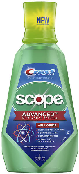 A Crest SCOPE ADVANCED Multi-action formula szájvíz (1 liter) teljeskörű védelmet biztosít a fogaknak. Hatása : fri ssíti a leheletet a fluorid tartalmának köszönhetően véd a fogszuvasodástól erősíti a fogzománcot frissíti a leheletet tisztítja az egész szájüreget Fogmosás és fogselyem használata után alkalmazza kétszer naponta. Tartsa a szájában 30 másodpercen át,