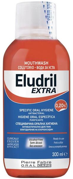 Eludril Extra 0.2% CHX Szájvíz, 300 ml Az ELUDRIL EXTRA segít fenntartani a jó szájhigiéniát, ha a fogmosás mellett használják bizonyos helyzetekben, például:Irritált íny a lepedék felhalmozódása vagy a fogszabályzó használata miatt. Fogászati kezelés előtt és után. Klinikailag bizonyított hatékonyság a lepedék ellen. Korlátozza a baktériumok elszaporodásának kock