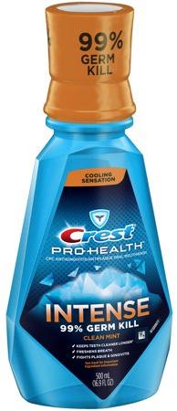 A Crest Pro Health INTENSE szájvíz elpusztítja a baktériumok 99 %-át a szájüregben anélkül, hogy kellemetlen orvosi utóíze lenne. Friss leheletet biztosít az erős mentol ízesítésének köszönhetően. Teljeskörű védelmet biztosít a fogaknak. Hatása : fri ssíti a leheletet a baktériumok 99 %-át elpusztítja eltávolítja a fogkövet véd a fogszuvasodástól erősíti a fogz