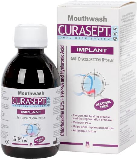 CURASEPT ADS® IMPLANT szájöblögetô (0,20% CHX, 200ml) 0,2% klórhexidin + PVP-VA és hialuronsav Elôsegíti a gyógyulási folyamatot és a szövetek regenerálódását Csökkenti a fájdalmat Segítséget jelent implantálást követôen Plakk ellenes hatású A Curasept ADS® IMPLANT szájöblögetô egy hatékony plakkcsökkentô készítmény, melynek alapja a 0,2% klórhexidin, szabada