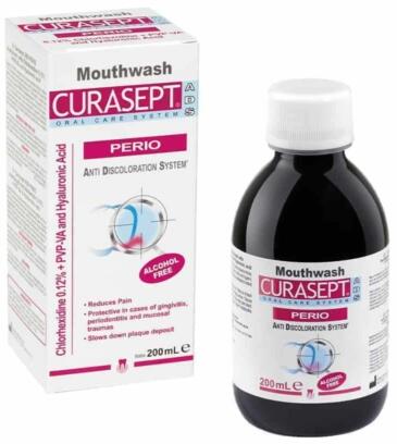 CURASEPT ADS® PERIO szájöblögető (0,12% CHX, 200ml) 0,12% klórhexidin + PVP-VA és hialuronsav Csökkenti a fájdalmat Védelmet nyújt ínygyulladás, fogágygyulladás és nyálkahártya sérülések esetén Lassítja a plakk felhalmozódásátA Curasept ADS® PERIO egy innovatív és hatékony szájöblögető készítmény hosszantartó kezelésekhez. 0,12% klórhexidint tartalmaz, amely
