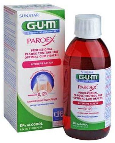 A GUM Paroex 0,12% klórhexidin tartalmú szájvíz a beteg fogíny (gingivitis, parodontitis) kezelésére alkalmas. Használata kúraszerűen ajánlott , egyhuzamban maximum 3 hétig, akár szájsebészeti beavatkozások előtt és után, foghúzás vagy implantáció esetén is. Használható rögzített fogszabályozó, implantátum, fogpótlás (korona, híd) vagy műfogsor esetén is. Csökk