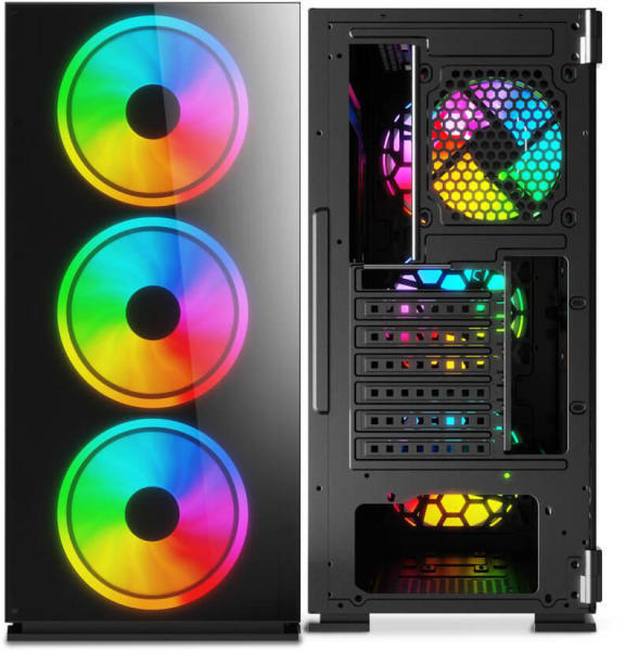 SAVIO Prime X1 ARGB PC Case Glass Tempered glass front Hinged tempered glass side door Addressable ARGB lighting system with four ARGB 120 mm fans 3 pieces on the front and 1 on the back ARGB fan control system by remote control / restart button / motherboard and by voice control Splitter for 6 fans and ARGB strips Two-chamber design with power supply place A set of dust filters Wide compatibility
