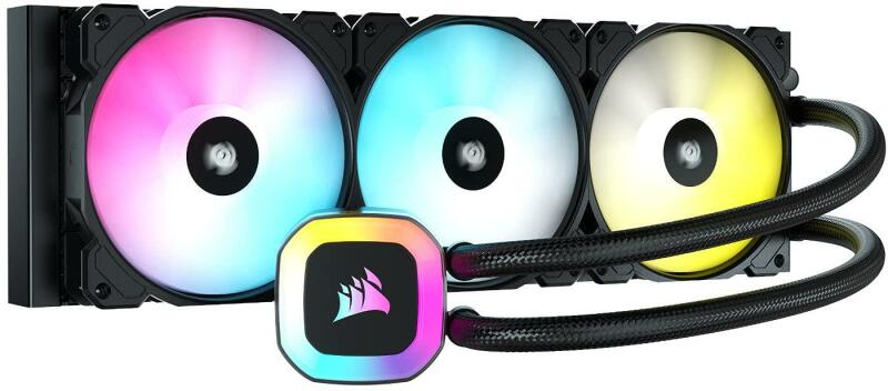 The Corsair H150 RGB all-in-one liquid CPU cooler delivers powerful, reliable cooling and stunning RGB lighting. The large 360 mm radiator dissipates heat, and three Corsair SP120 RGB Elite PWM fans provide excellent cooling performance. Each fan is equipped with Corsair AirGuide technology, which directs concentrated airflow and optimizes cooling, against a colorful background of eight individual