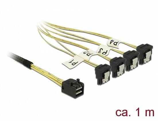 Ez a Delock SAS kábel belső SAS eszközök csatlakoztatására hasznáható, pl. egy vezérlő Mini SAS HD csatlakozóval 4 HDD-hez SATA portokkal. Műszaki adatok: Csatlakozó: host: 1 x Mini SAS HD SFF-8643 dugó eszköz: 4 x 7 érintkezős SATA hüvely, lefelé néző csatlakozódugóval Fémkapcsokkal Serial Attached SCSI (SAS) specifikáció Akár 6 Gb/s sebességű adatátvitel Kábel vast
