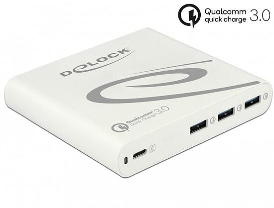 Ez a Delock USB Power Delivery (PD) töltő a laptopok töltésére használható az USB Type-C csatlakozóján keresztül. Különböző feszültségeket biztosít 5 V-tól 20 V-ig, és akár 85 W-ot is képes leadni. Ezen kívül 3 db USB A-típusú 5 V-os csatlakozó is elérhető a hagyományos eszközök számára, Qualcomm Quick Charge 3.0 töltési technológiával. A speciális töltési t