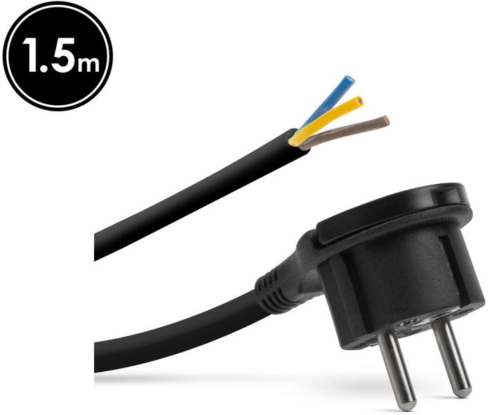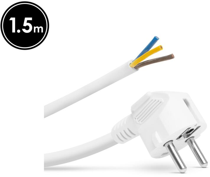 Műszaki adatok: - Dugó típusa: A - védőérintkezős - Dugó kivitele: 90°-ban hajlított - Max. áramerősség 10 / 16 A - Névleges feszültség: 250 V AC, 50/60 Hz - Vezeték típus: H05VV-F 3G 1,5 mm2 - Vezeték hossza: 1,5 m - Szín: Fehér Termékleírás: Szerelhető tápkábel földeléssel és szereletlen kábelvégződéssel. Ideális lehet beltéren használatos eszközök hálóza