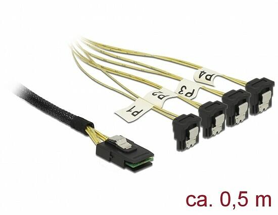 Ez a Delock SAS kábel belső SAS eszközök csatlakoztatására hasznáható, pl. egy vezérlő Mini SAS csatlakozóval 4 HDD-hez SATA portokkal. Műszaki adatok: Csatlakozó: host: 1 x Mini SAS SFF-8087 dugó eszköz: 4 x 7 érintkezős SATA hüvely, lefelé néző csatlakozódugóval Fémkapcsokkal Serial Attached SCSI (SAS) specifikáció Akár 6 Gb/s sebességű adatátvitel Kábel vastagság