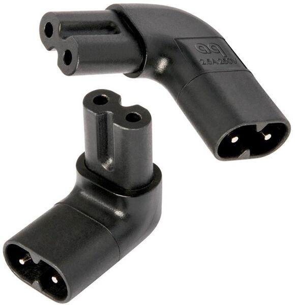 AudioQuest C7/C8 tápcsatlakozó 90 fokos adapter készlet, 1-1 darab vízszintes és függőleges átalakítóval, melynek segítségével "helyhiány" esetén, falhoz közel elhelyezett TV vagy más elektronika tápkábele 90 fokos szögben csatlakoztatható