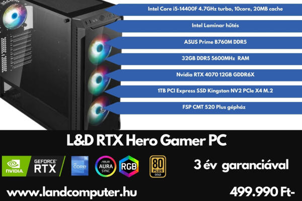 Processzor: Intel Core i5-14400F 4.7GHz turbo, 10core, 20MB cache Hűtés: Intel Laminar hűtés Alaplap: Asus PRIME B760M DDR5 Memória: 32GB DDR5 5600MHz K RAM Videókártya: Nvidia GeForce RTX 4070 12GB GDDR6X Háttértár: 1TB PCI Express SSD Kingston NV2 PCIe X4 M. 2 Gépház: FSP CMT 520 PLUS Tápegység: Power Play 650W Gold3év garancia