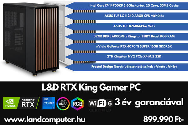 Processzor: Intel Core i7-14700KF 5.6GHz turbo, 20core, 33MB cache Hűtés: ASUS TUF LC II 240 ARGB CPU vízhűtés Alaplap: ASUS TUF B760M-PLUS WiFi Memória: 32GB DDR5 6000MHz Kingston FURY Beast RGB RAM Videókártya: Nvidia GeForce RTX 4070 Ti SUPER 16GB GDDR6X Háttértár: 2TB PCI Express SSD Kingston NV2 PCIe X4 M. 2 Gépház: Fractal Design North (válaszható színben : fekete vag fehér)