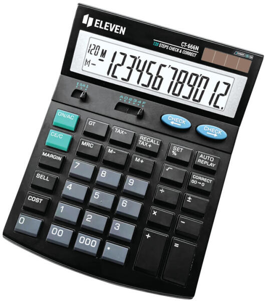 Dönthető, kétsoros LCD-kijelző, költség-értékesítés-árrés számolási funkciók, százalék- és adószámítás. 4 funkciós memória, automatikusan kikapcsol. Ellenőrzési és javítási funkciók. Elemmel és napelemmel is működik.