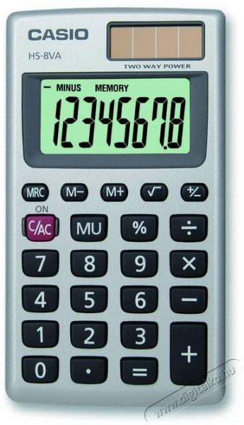 8 számjegyes, nagy kijelző Fémház Elemmel és napelemmel működik Fehér színű A Casio HS-8VA hordozható számológép 8 számjegyes, nagy kijelzővel rendelkezik. A készülék elemmel és napelemmel működik. Funkciók: alapműveletek (összeadás, kivonás, szorzás, osztás), gyökvonás, százalékszámítás. A számológép kemény ütésálló fémházzal és tokkal rendelkezik.