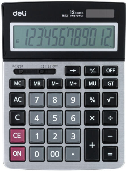 12 számjegyű, nagy LCD döntött kijelző ÁFA számítás Valutaátváltás % számítás. +/- gomb Elem+napelem Garancia: 2 év .