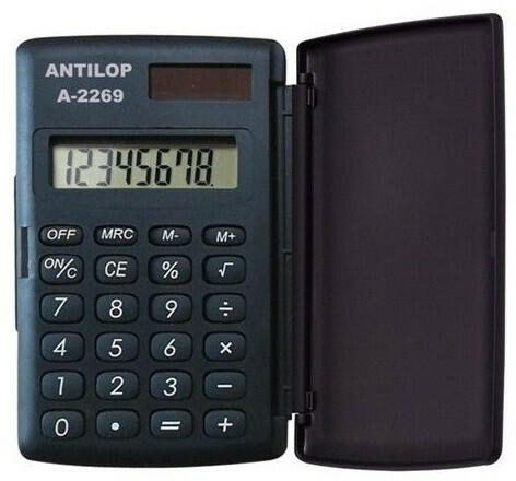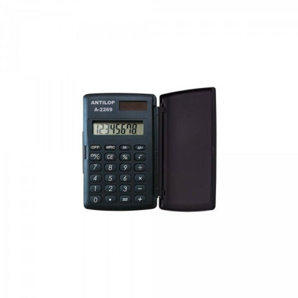 Antilop kék-fehér zsebszámológép. 8 számjegyes kemény műanyag fedeles, gumírozott nyomógombokkal. Műveletek: alapműveletek, százalékszámítás, gyökvonás, memória Működési mód: napelem+gombelem. Katalóguskód: 1799