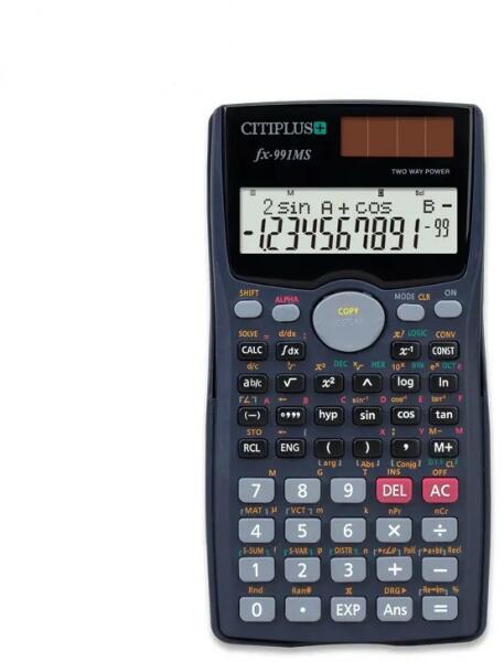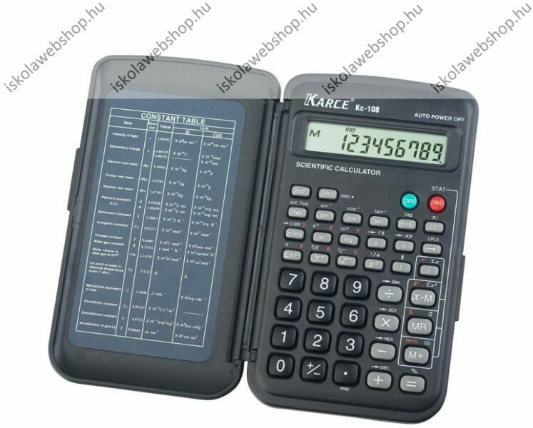 Termék leírás: - Tudományos számológép; - 10+2 számjegyes, egysoros kijelző, könnyen kezelhető billentyűzetfedél, műanyag gombok, automatikus kikapcsolás, kikapcsológomb; - áramforrás: elem, - funkciók: 56 tudományos funkció, statisztikai számítások, trigonometriai függvények, memória; - karaktermagasság: 8,0 mm