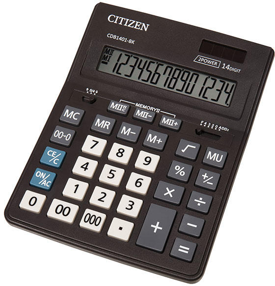 Kompakt asztali számológép alapvető funkciókkal és 14 számjegyű, enyhén döntött kijelzővel.