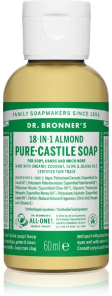Dr. Bronner’s Almond, 60 ml, folyékony szappanok nőknek, Tulajdonságok: lemossa a bőrt és eltávolítja a szennyeződéseket táplálja és ápolja a bőrt lágyítja és elasztikusabbá teszi a bőrt Használata: Vigye fel a nedves kezére és gyengéden habosítsa fel. Zuhanyozás vagy fürdés során alkalmazza. Vigye fel a teljes testfelületre, majd öblítse le meleg vízzel.