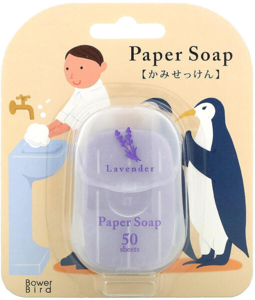 Papírlap vékonyságú szappan lapok. 50 db szappanlap van egy csomagban. Vízzel kell használni, mint a hagyományos szappant. Praktikus utazáshoz vagy csak a mindennapokban. Ha szeretne szappant magával vinni arra az esetre, ha a mosdóban ne lenne szappan. Nem kell attól félni, hogy a kis vizes szappan kiborul a tartóból a táskában. A szappanlapok praktikus műanyag tartóban vannak.