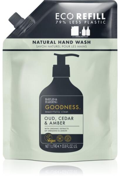 Baylis & Harding Goodness Oud, Cedar & Amber, 1000 ml, folyékony szappanok nőknek, A praktikus Baylis & Harding Goodness folyékony szappan kímélően, de hatékonyan tisztítja a kezét, egyben biztosítja számára a szükséges táplálást és ápolást. Tulajdonságok: hatékonyan mossa a kezet tisztává teszi a kezet hidratálja és ápolja a bőrt kézmosás közben kellemes