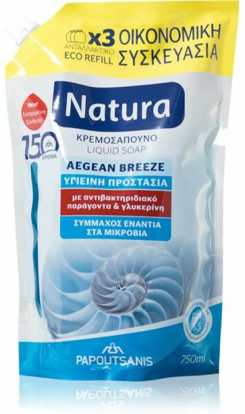 PAPOUTSANIS Natura Aegean Breeze, 750 ml, Utántöltők nőknek, A folyékony szappan kímélően, de hatékonyan tisztítja a kezét, egyben biztosítja számára a szükséges táplálást és ápolást. Tulajdonságok: hatékonyan mossa a kezet eltávolítja a szennyeződéseket és a baktériumokat hidratáló hatású Használata: Használja szükség szerint.